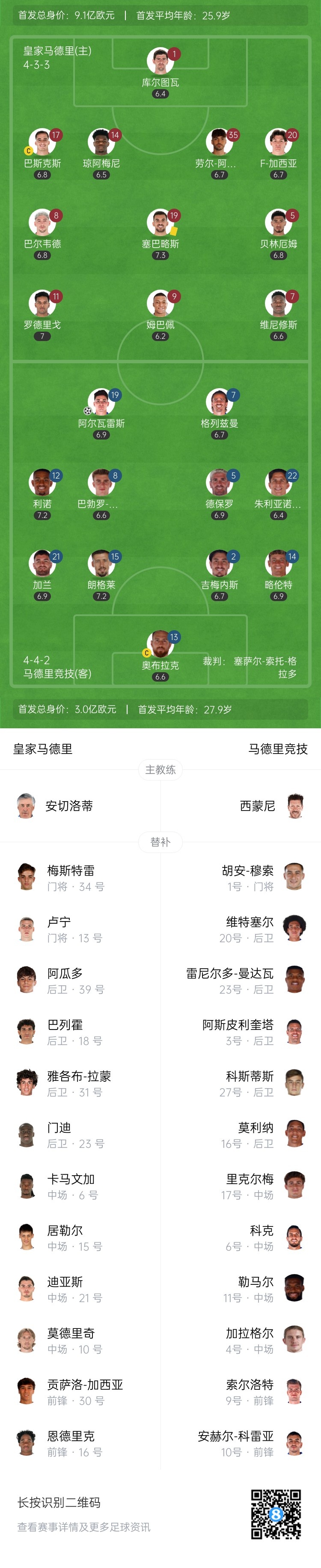 2月9日訊 北京時間4:00,西甲第23輪迎來榜首大戰(zhàn)!皇馬主場迎戰(zhàn)馬競,比賽在伯納烏球場打響。上半場,瓊阿梅尼送點,安切洛蒂掩面!阿爾瓦雷斯勺子點球破門!半場結(jié)束,馬競暫時1-0領(lǐng)先皇馬。