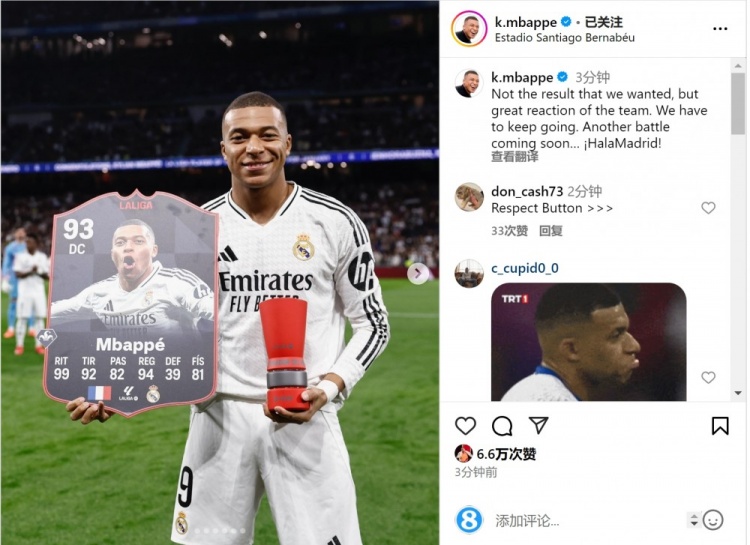 姆巴佩社媒曬出自己領(lǐng)取西甲1月最佳球員獎(jiǎng)杯的照片,配文:“這不是我們想要的結(jié)果,但球隊(duì)做出了很好的反應(yīng)。”