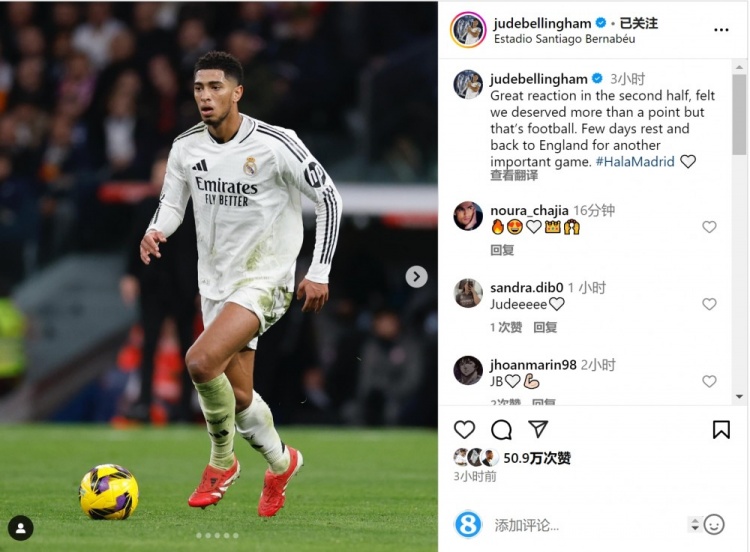 2月9日訊 西甲第23輪比賽,貝林厄姆踢滿全場,幫助皇馬主場1-1戰(zhàn)平馬競。貝林厄姆曬出自己的比賽照片,配文:“球隊(duì)下半場的反應(yīng)很好,我覺得我們理應(yīng)拿到更多的積分,但這就是足球?!?/p>“休息幾天,然后回到英格蘭參加另一場重要比賽(歐冠對曼城)?!?/p> 本文標(biāo)簽: 足球 西甲 皇家馬德里 貝林厄姆
