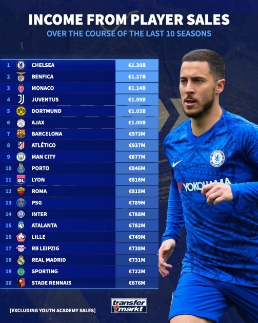 2月9日訊 德國轉(zhuǎn)會市場統(tǒng)計了近10個賽季各俱樂部出售球員所得收入的排名,切爾西通過賣球員賺到13億歐元轉(zhuǎn)會費,排名第一。