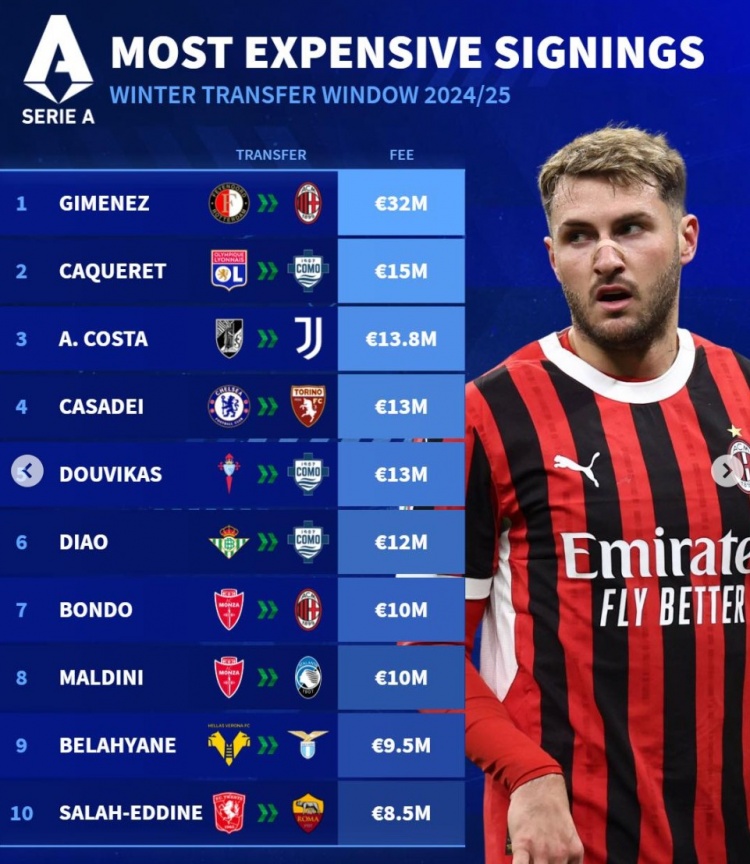 2月10日訊 五大聯(lián)賽冬窗已經(jīng)結(jié)束,《轉(zhuǎn)會(huì)市場(chǎng)》也列出了意甲冬窗引援最貴榜單,米蘭中鋒圣地亞哥-希門(mén)尼斯領(lǐng)銜。