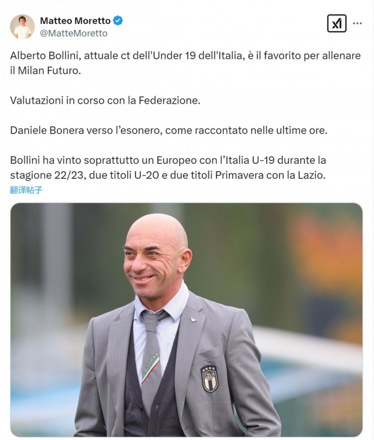 2月10日訊 據(jù)記者莫雷托透露,意大利U19青年隊主帥博里尼是米蘭未來隊新帥熱門人選。根據(jù)媒體的報道,米蘭未來隊主帥博內(nèi)拉即將被解雇。莫雷托指出,意大利U19青年隊現(xiàn)任主帥博里尼是接手米蘭未來隊的熱門人選,他正與意大利足協(xié)評估未來。博里尼是一位58歲的意大利教練,曾擔任薩勒尼塔納、摩德納主帥,帶領(lǐng)意大利青年隊贏得2023年U19歐洲杯冠軍。 本文標簽: 足球 意甲 AC米蘭